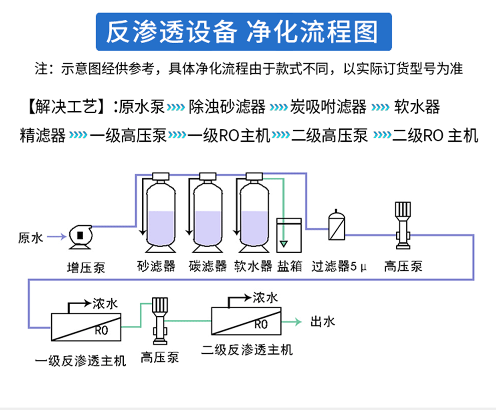 源水→增壓泵→機械過濾器(多介質(zhì)過濾器/石英砂過濾器)→活性炭過濾器→軟化過濾器(阻垢加藥系統(tǒng)→PH調(diào)節(jié)系統(tǒng)→精密過濾器(保安過濾器)→一級反滲透主機高壓泵→一級反滲透裝置→二級反滲透系統(tǒng)高壓泵→二級反滲透裝置→0.22U精密過濾器→純水箱