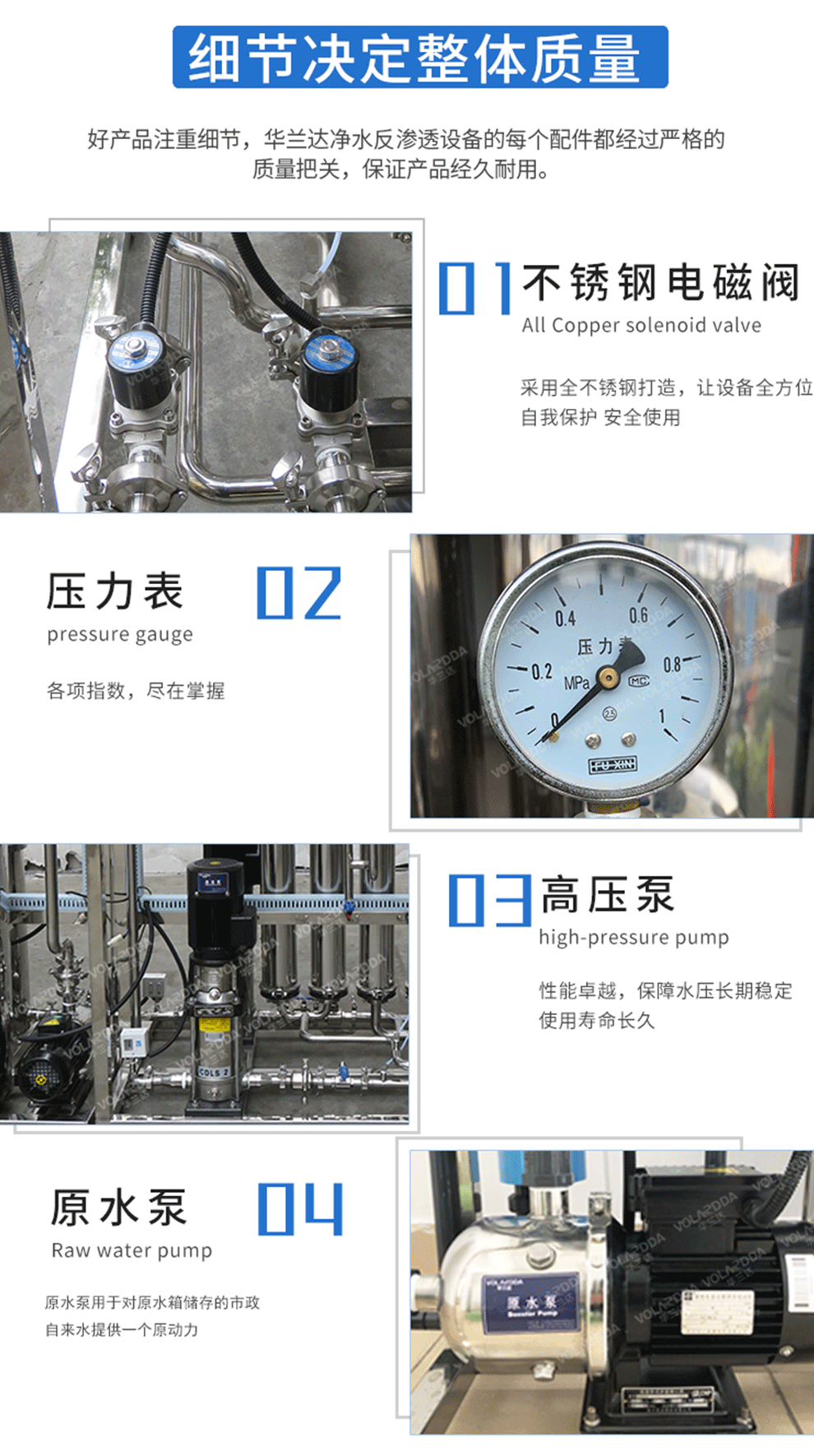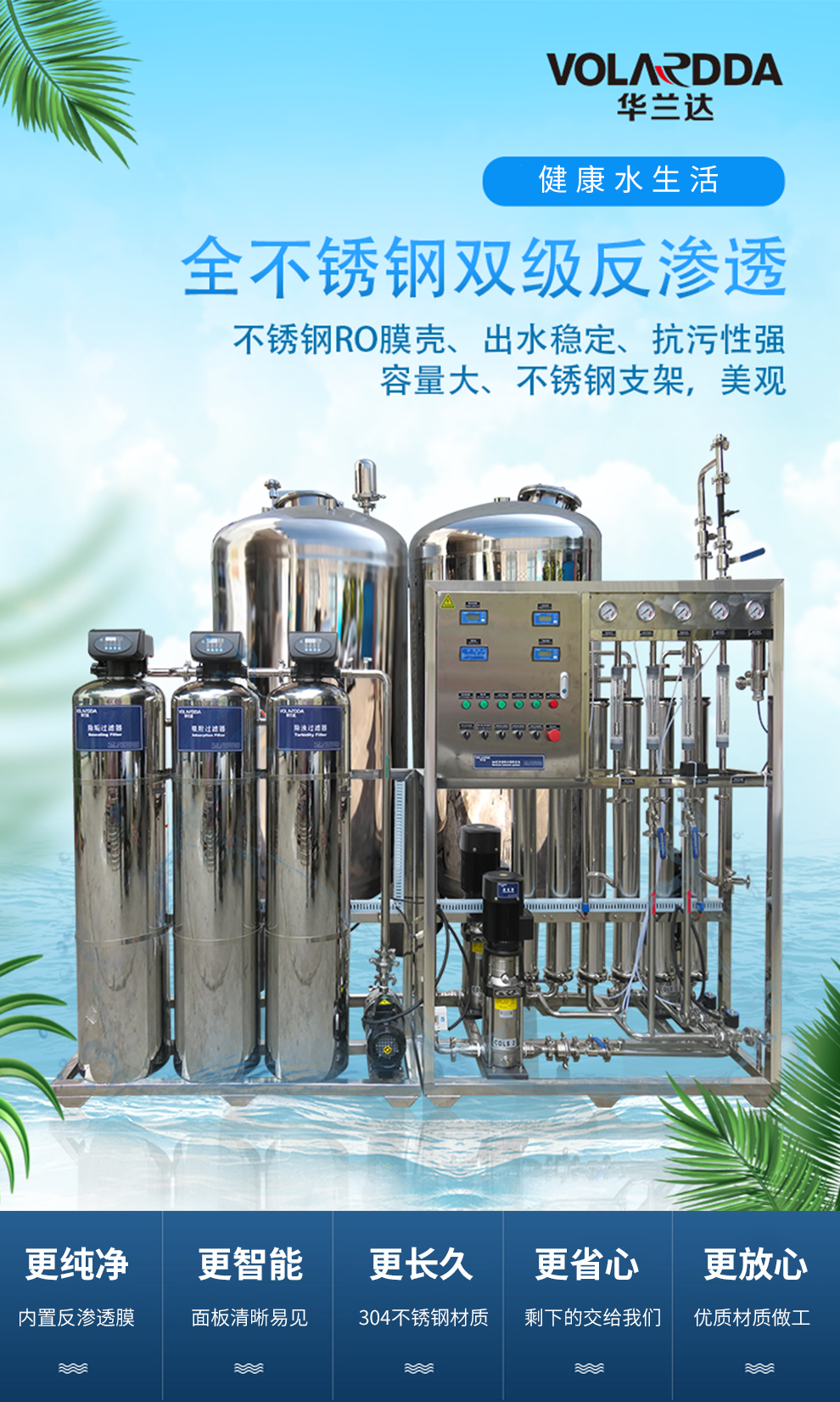 2、脫鹽率:反滲透系統>99%(根據客戶終端用水要求,可定制單級或雙級反滲透機)