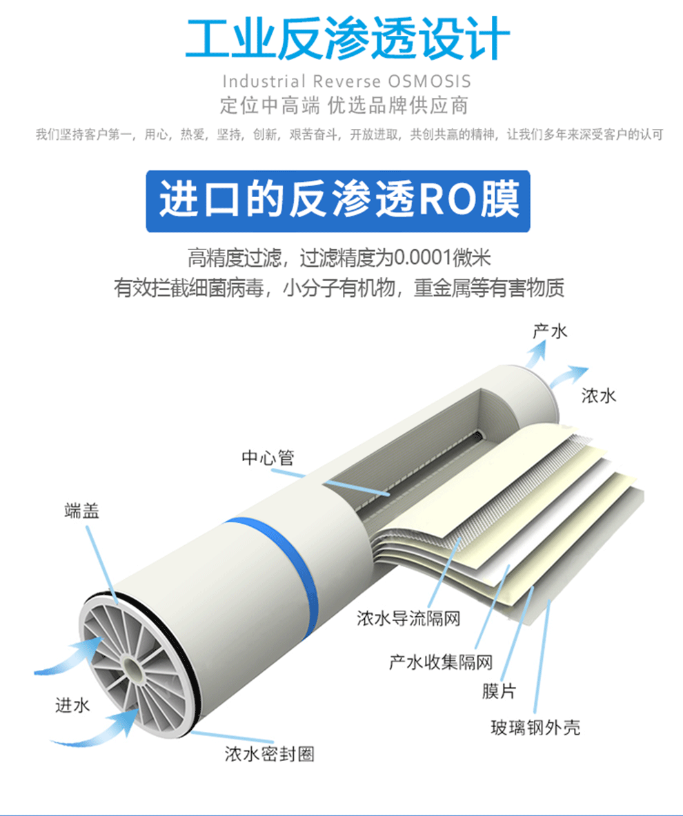 RO反滲透設備是利用足夠的壓力使溶液中的溶劑(一般常指水)通過反滲透膜(一種半透膜)而分離出來,方向與滲透方向相反,可使用大于滲透壓的反滲透法進行分離、提純和濃縮溶液。利用反滲透技術(shù)可以有效的去除水中的溶解鹽、膠體,細菌、病毒、細菌內(nèi)毒素和大部分有機物等雜質(zhì)。反滲透膜的主要分離對象是溶液中的離子范圍,無需化學品即可有效脫除水中鹽份,系統(tǒng)除鹽率一般為98%以上。所以反滲透是先進的、也是節(jié)能、環(huán)保的一種脫鹽方式,也成為了主流的預脫鹽工藝。