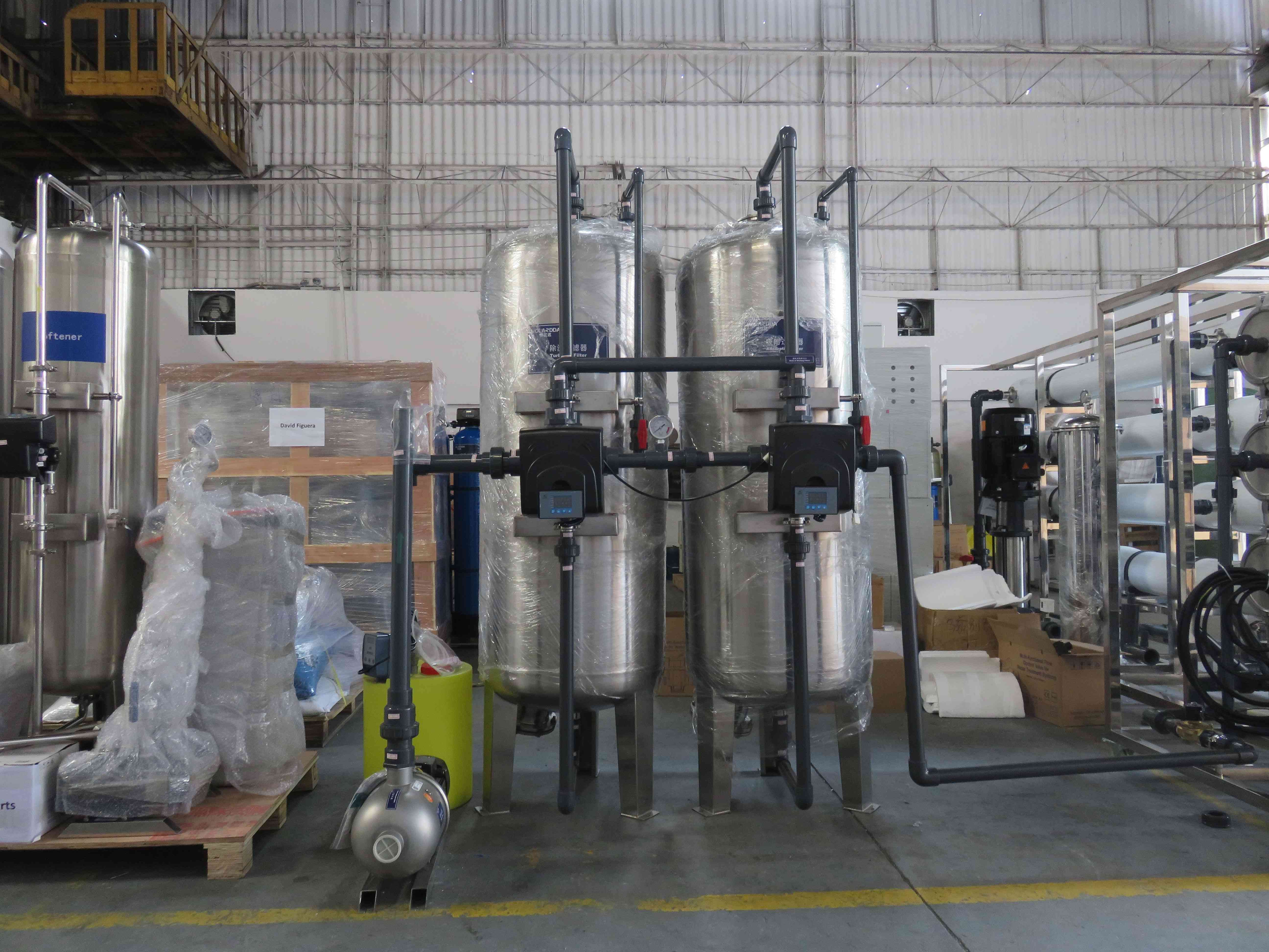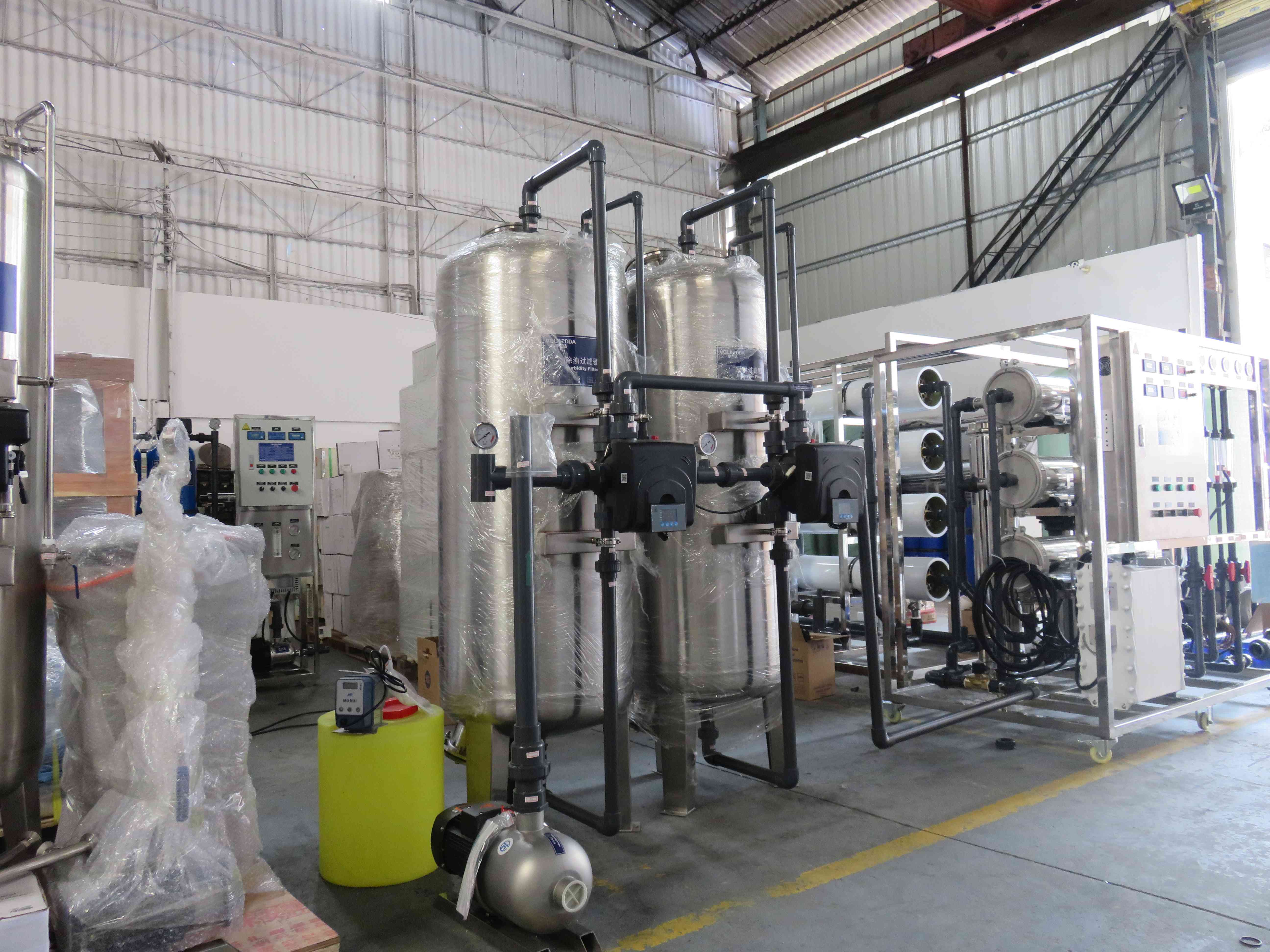 原水→原水箱→增壓泵→砂過濾器→活性炭過濾器→阻垢劑裝置→5μ精密過濾器→一級高壓泵→一級膜處理系統(tǒng)→一級RO水箱→二級高壓泵→二級膜處理系統(tǒng)→二級RO水箱。